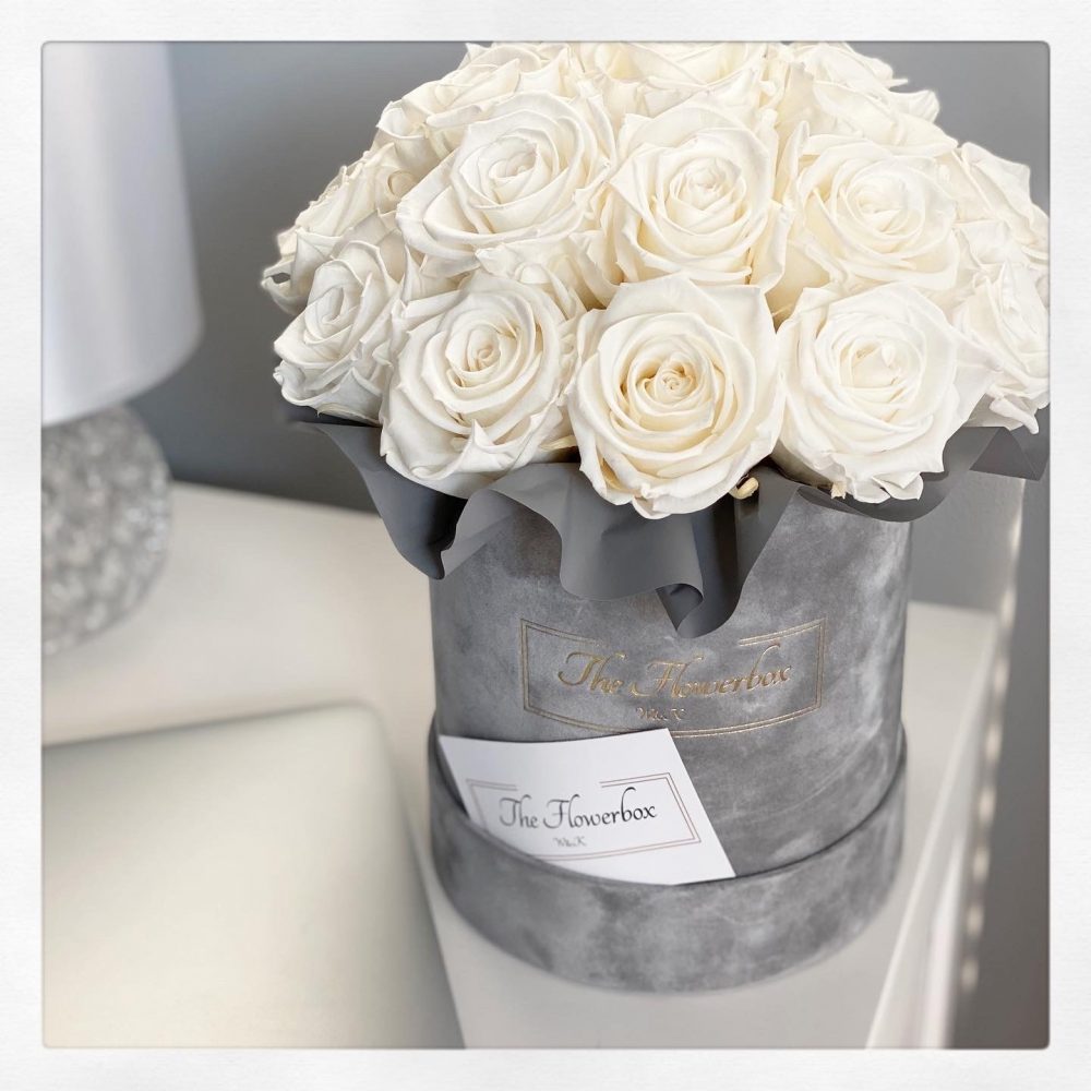 Białe wieczne róże | Średni szary box