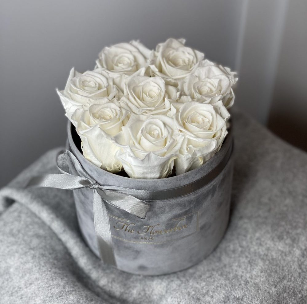 Strona główna Średni Flower Box Białe wieczne róże | Średni szary box