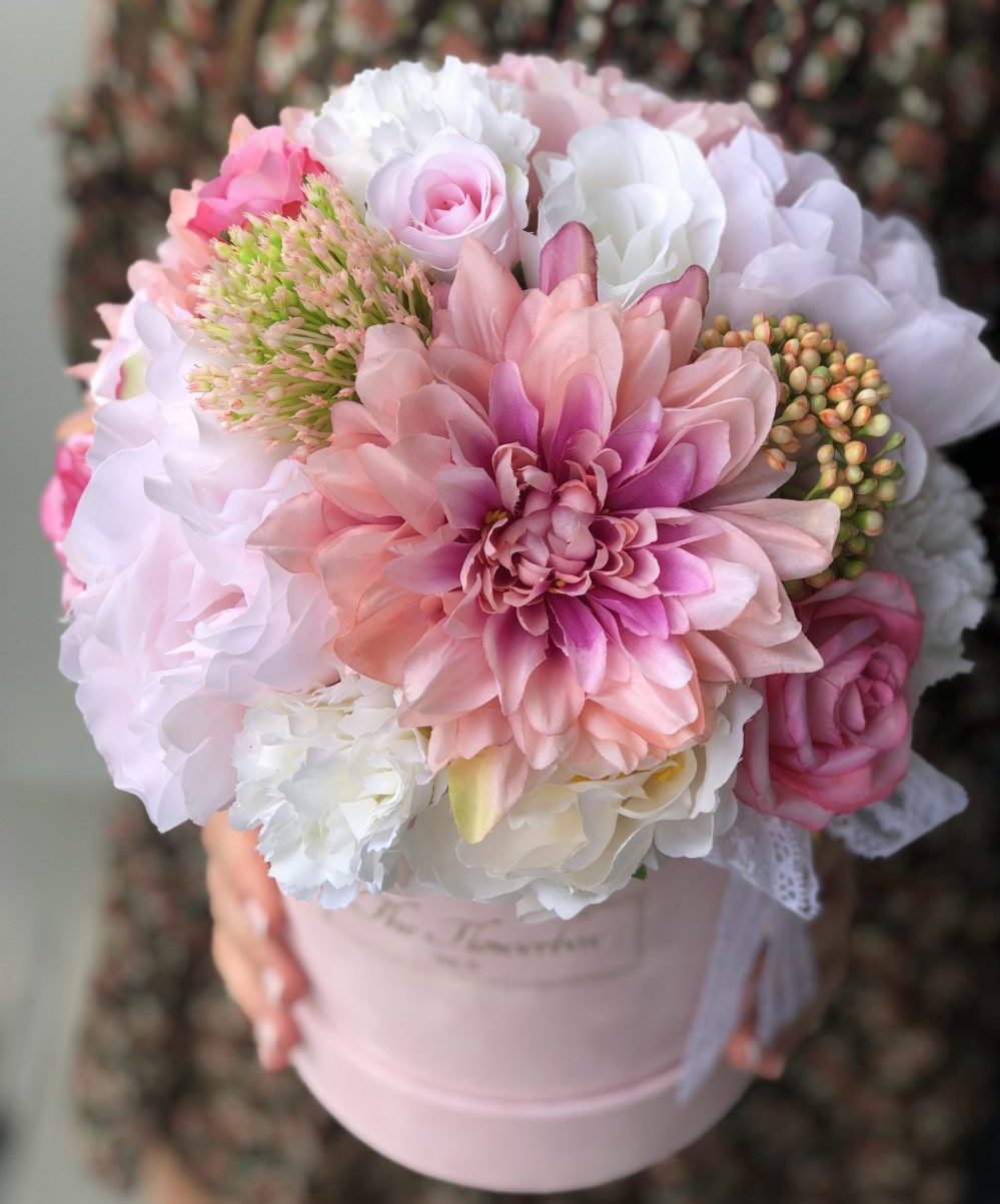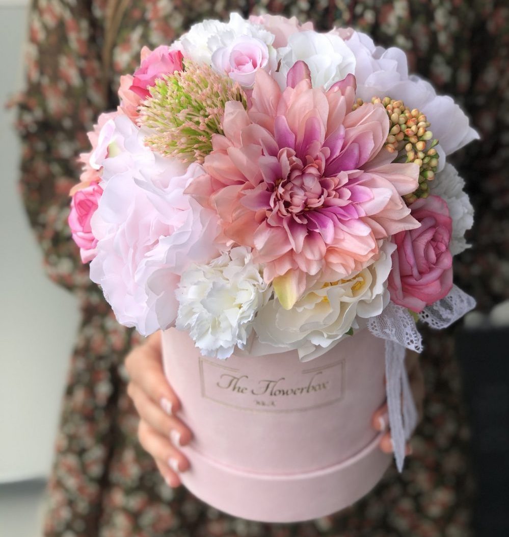 Urzekające zamszowe pudełko w kolorze pudrowego różu, z pozłacanym logo a w nim kompozycja stworzona, ze sztucznych kwiatów. Uroczy Flower Box podaruj bliskiej osobie, lub wystrój wnętrze swojego domu.
