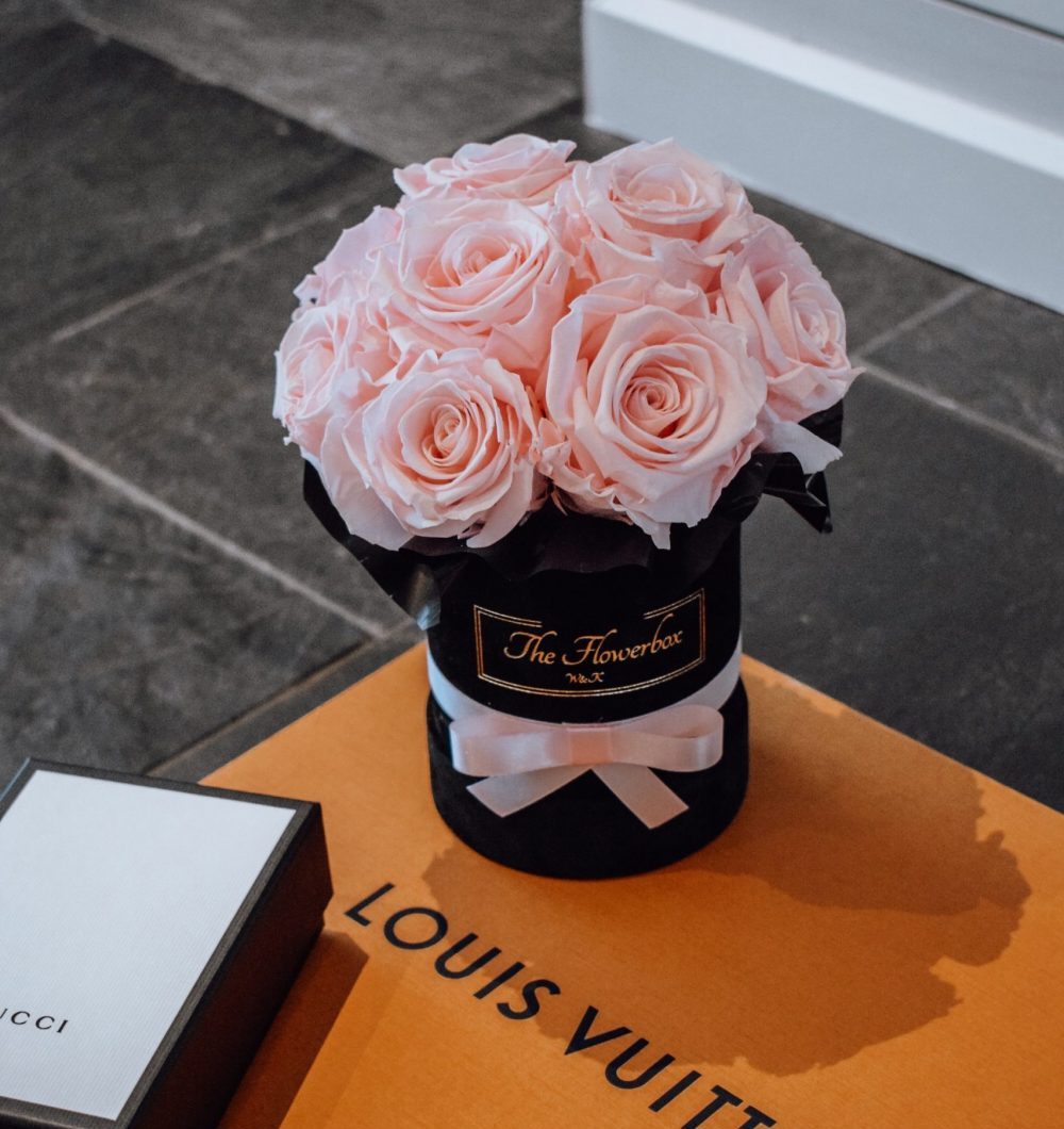 Wieczne róże, żywe i sztuczne kwiaty w eleganckich zamszowych pudełkach.