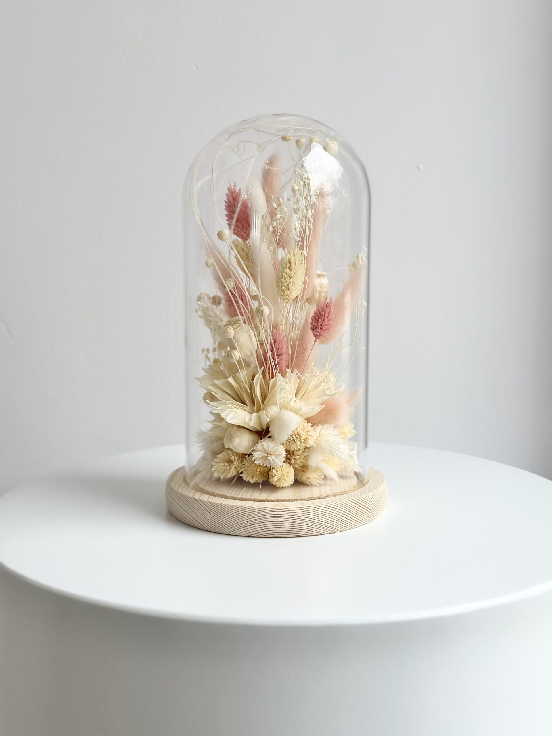 Kompozycja suszonych roślin zamknięta w szklanej kopule z drewnianą podstawką. To niezwykle estetyczny element wystroju wnętrz. Kompozycja, która zachwyca swoją subtelnością i wyjątkowym charakterem. Trwała dekoracja, która pozostanie w Twoim domu latami. Niezwykła dekoracja i idealny prezent na bezwzględnie – każdą okazję! Sprawdź nasz produkt i pokochaj suszone kompozycje zamknięte w szkle 🎀