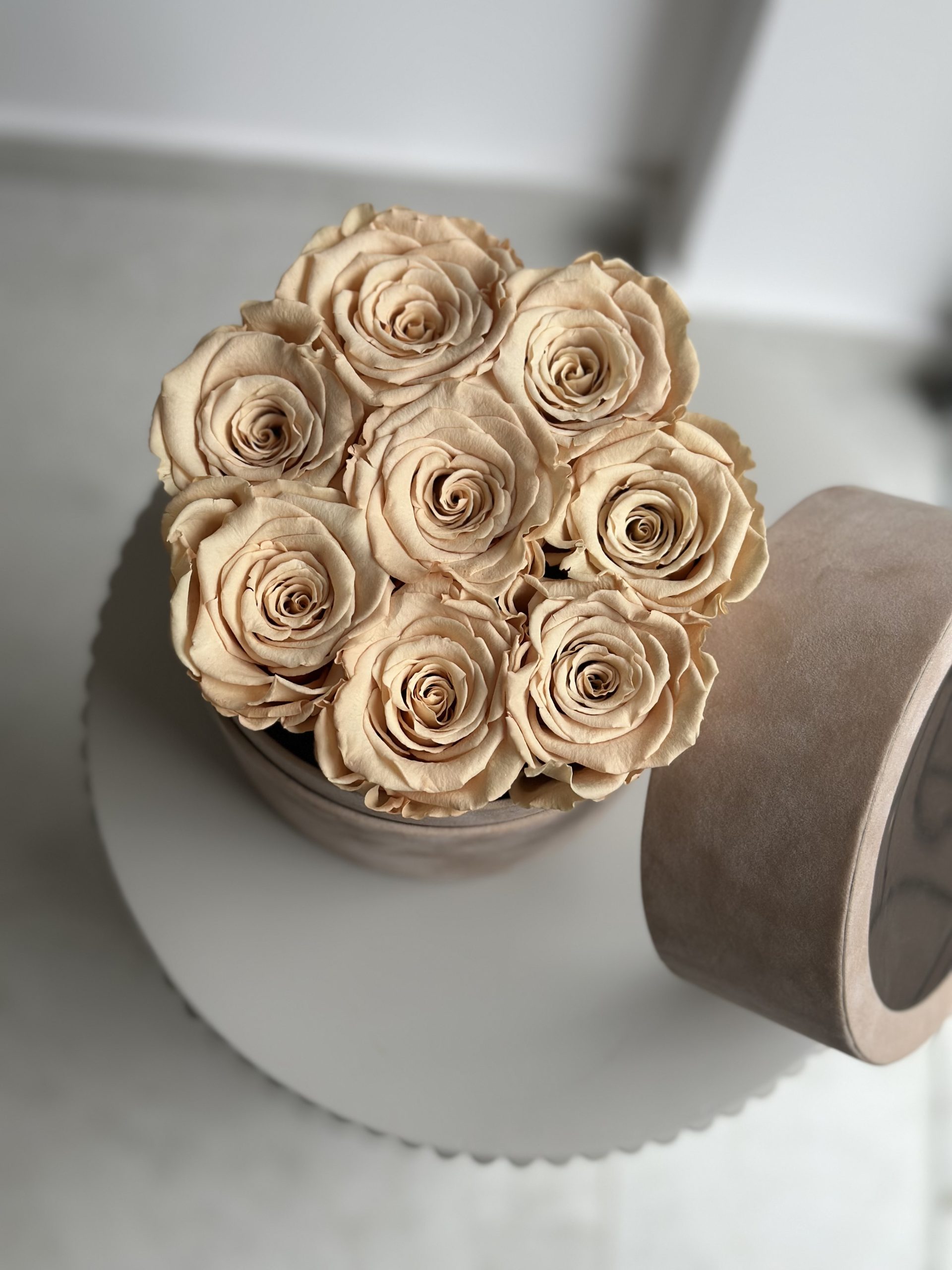 Wyjątkowe, niespotykane wieczne róże w kolorze Toffie! Dodatkowo są to róże, które pozostaną świeże przez 2 lata! Beżowy, welurowy box to ekskluzywny prezent na każdą okazję oraz niepowtarzalny wystrój wnętrz ❤️